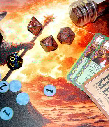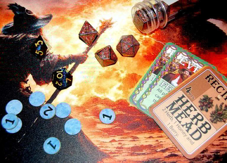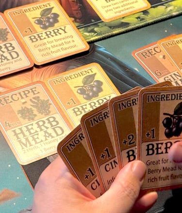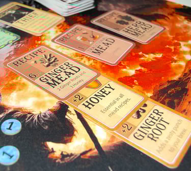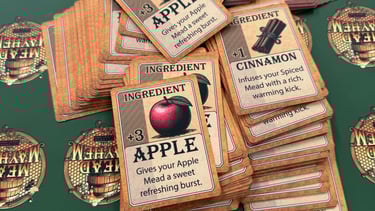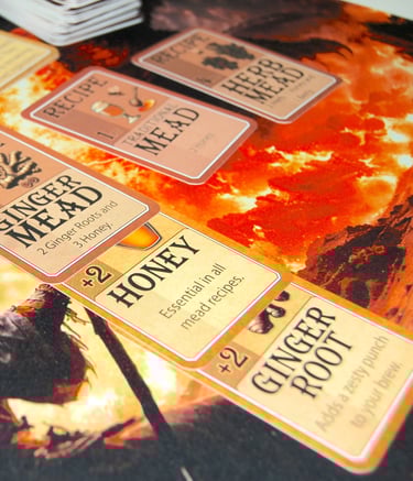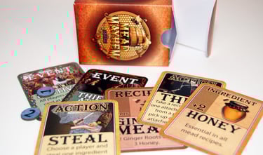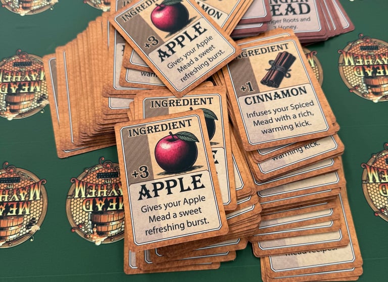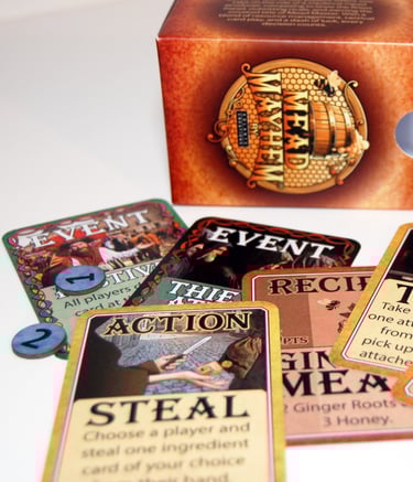 Mead Mayhem® is a fast-paced, creative card game where strategy and surprise collide. Designed for two to four players where you play as a medieval mead maker, competing to brew the finest mead. Players lay down Mead Recipes, add ingredients, and use clever action cards to outwit friends. Each round is shaped by Event cards that can help or hinder your plans. Complete recipes to earn Mead Points, and be the first to reach 10 to claim victory!